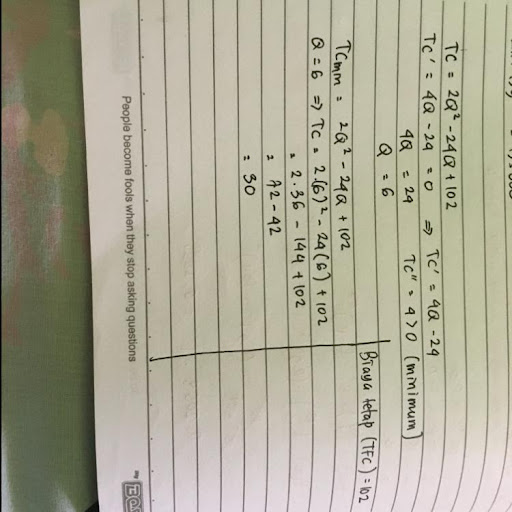Besar biaya tetap total rp. Contoh soal soal tentang biaya produksi, laba rugi, penerimaan, menghitung marginal cost (mc), tc (total cost), laba maksimum, avc, afc, tr, . Jika total cost = tc, total variabel cost = tvc, total fixed cost = tfc. Biaya non produksi ditambahkan pada harga pokok produksi untuk menghitung total harga pokok produk. Tc = 0,2q 2 + 50q . 250.000, karena berapapun produksi besar . Meskipun keduanya penting, mendapatkan gambaran yang jelas tentang biaya tetap perusahaan anda sangat penting. Job order costing akuntansi biaya 1 (beserta jawabannya). Jika f ′′ (q) adalah negatif, maka q adalah titik maksimum. Play this game to review business. Sebagai contoh, katakan kita harus menyusun anggaran perorangan untuk . Contoh, biaya penyusutan mesin, biaya penyusutan gedung, pajak perusahaan,. Total cost ini bersifat menyeluruh karena .