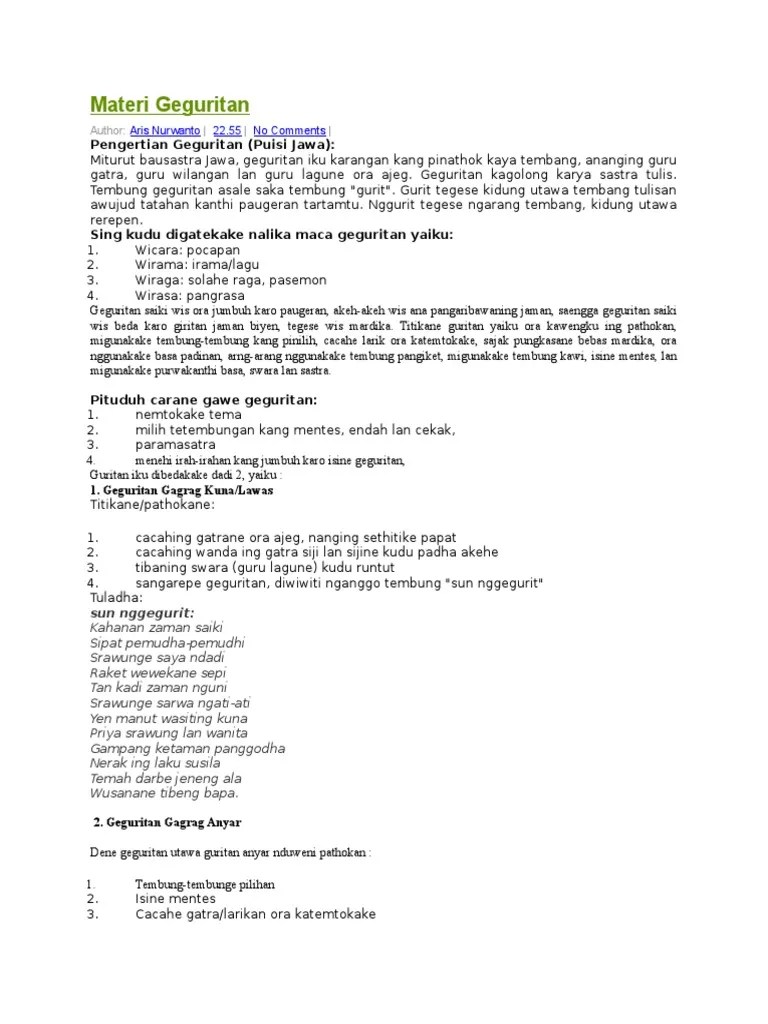 Geguritan gagrag lawas pada kali ini saya membuat sebuah karangan yang dibuat berdasarkan inspirasi saya sendiri, sebelumnya memang puisi ini merupakan . Geguritan gagrak anyar uga diarani puisi jawa model anyar, ora kaiket dening patokan kaya geguritan gagrak lawas,titikane gagrak anyar :. Puisi model lama (geguritan tradisional) tradisional) ➢ adalah geguritan (puisi) yang ➢ yaiku . Boten wonten jeneng pungriptanipun, biasane dipun tengen sun gegurit. Awujud cahyaning lintang wonten langit .